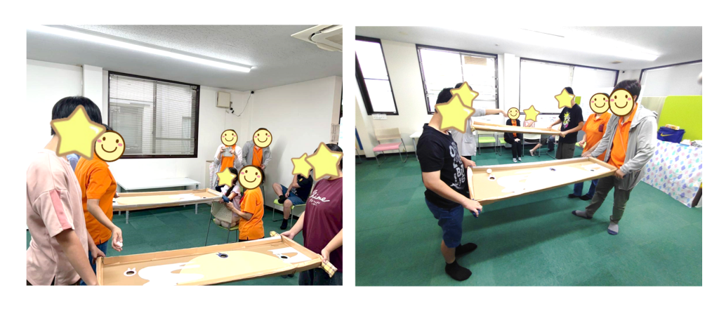 『玉転がしゲーム』では、ボードを2人で協力して動かし、穴にボールを入れます☺