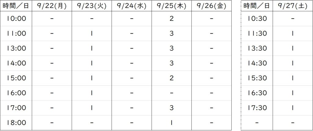 来週(9月22日~9月27日)の空き状況をお知らせいたします。