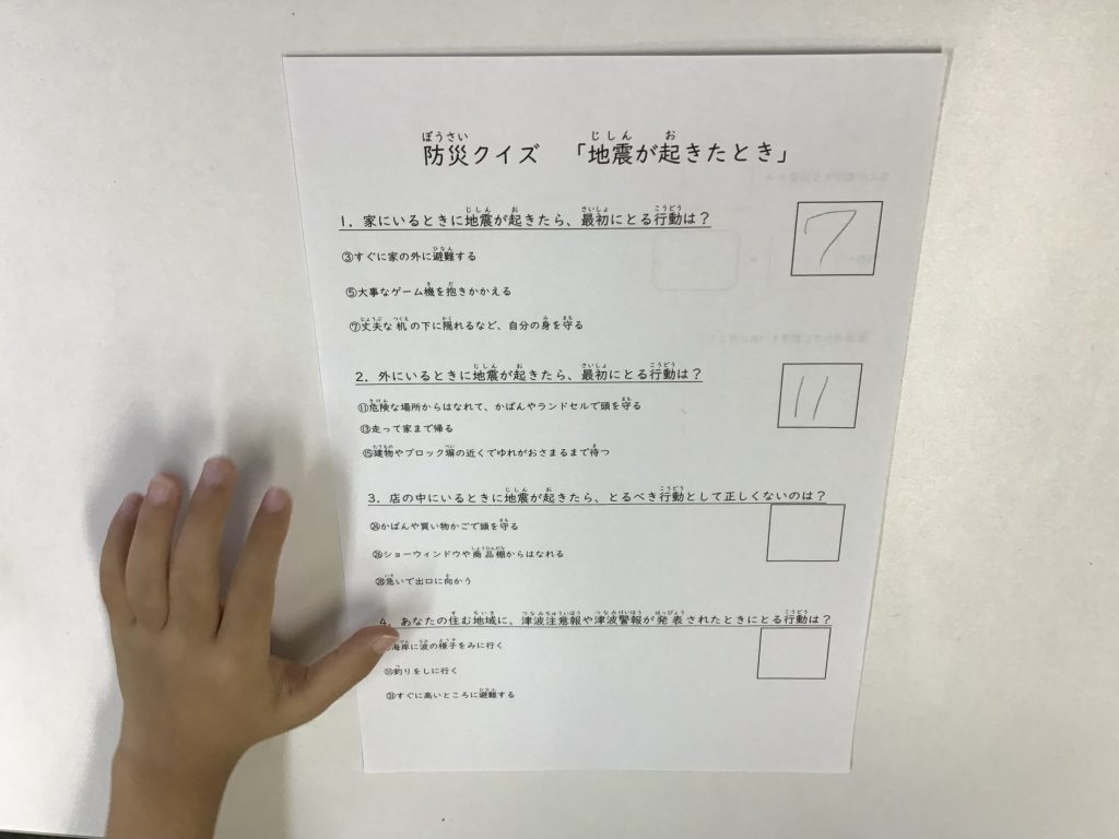 「地震が起きたときどう行動する?」など、もしものときに役立つ知識をクイズ形式で学びました✏️