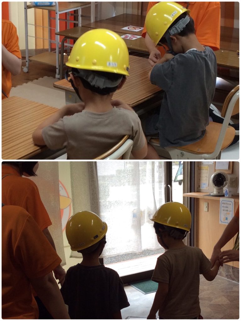 年長さんと一緒に、ヘルメットのかぶり方や避難方法の仕方について一緒に考えました(; ・`д・´)