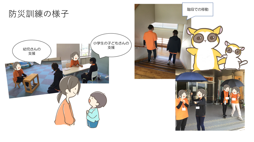 訓練では、幼児さんや小学生の子どもさんを支援している最中に土砂災害警戒情報が出て、避難しなければならない状況を想定して、行いました。