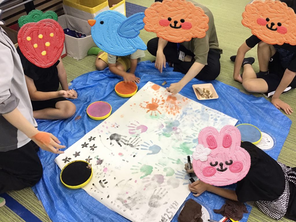 手形で太陽の形を作ったり、いろいろな色の手形を付けたりしてカラフルな絵を作り上げました😆