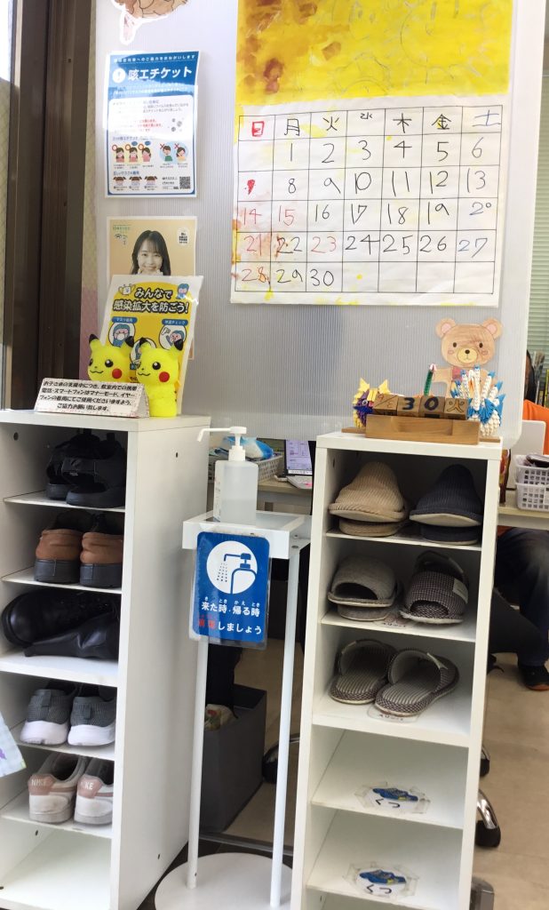 所沢校では教室に入ったところから支援が始まります。自分の靴をしまうことや手の消毒など、入室時に行うことの声掛けを行っております。決まりを守って行動できたことを褒めることで望ましい行動を続けられるようにしています。