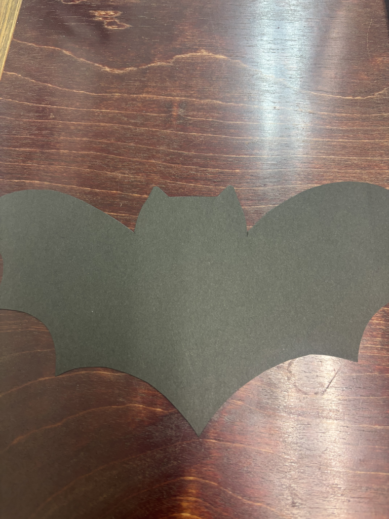 ①黒い画用紙を用意し、はさみでコウモリの形に切ります。