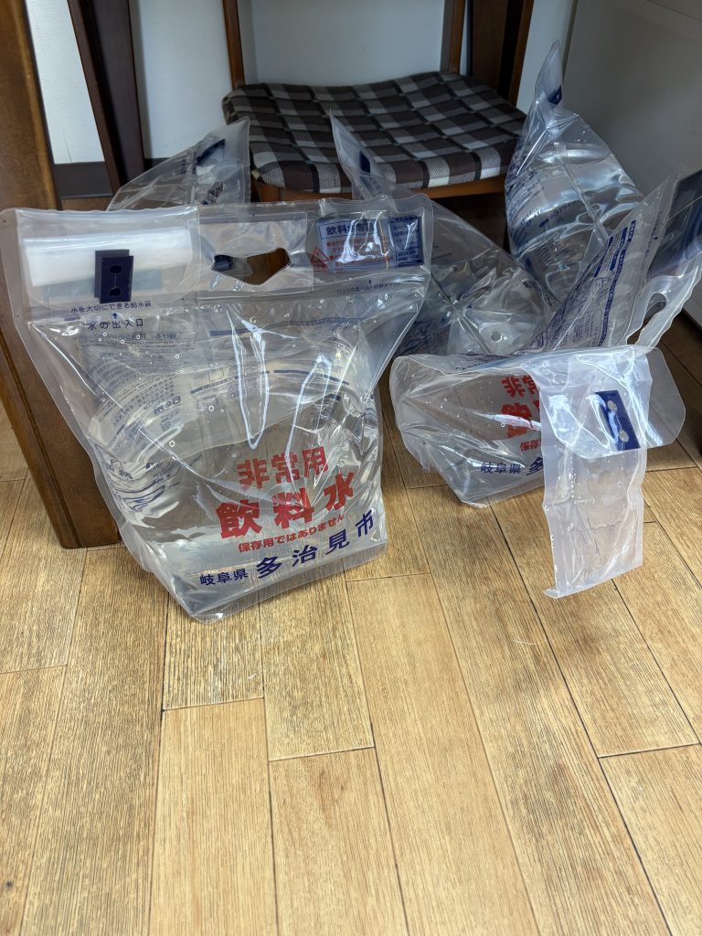 「きらり」の玄関の待合スペースに5つぐらい、袋につめたお水が並びました。