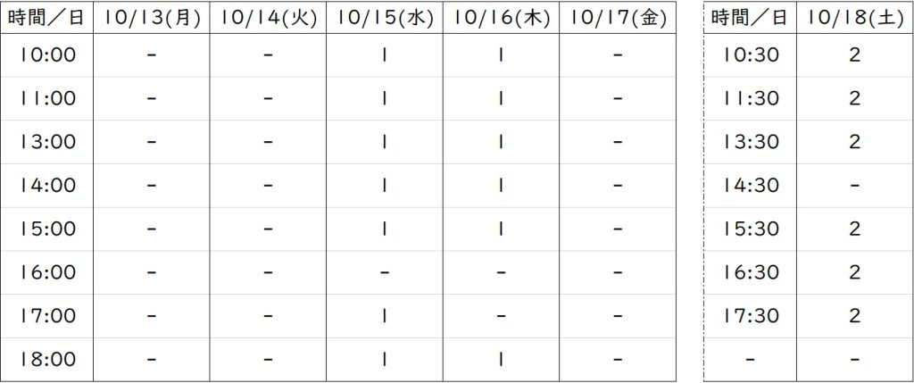 来週(10月13日~10月18日)の空き状況をお知らせいたします。
