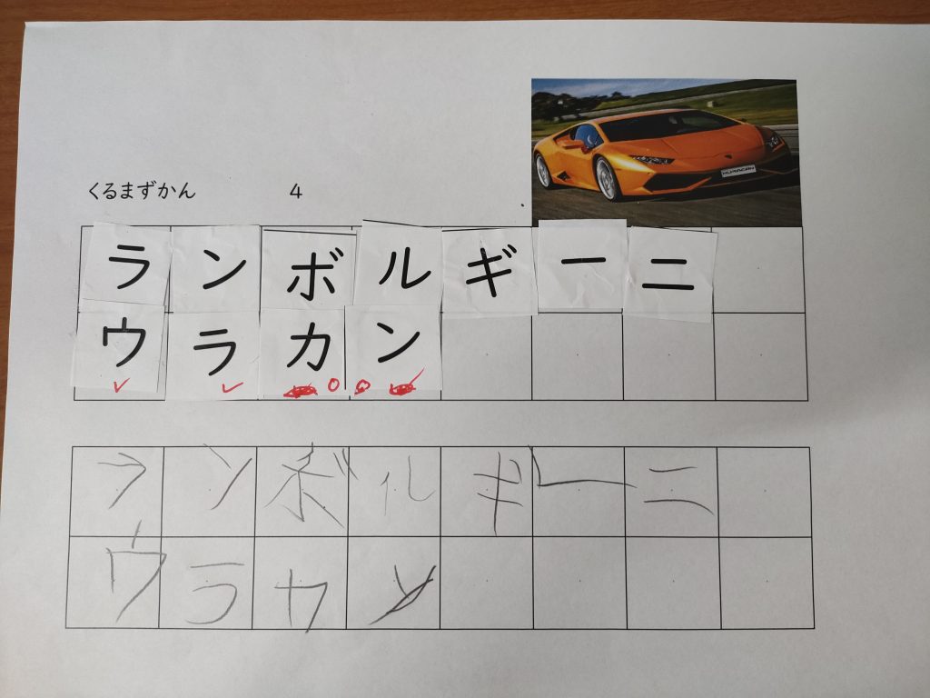 カタカナが苦手なお子さんが、「ランボルギーニ ウラカン]って書いたのです。大好きなことって自然と身につくし、興味を持って取り組めますね。