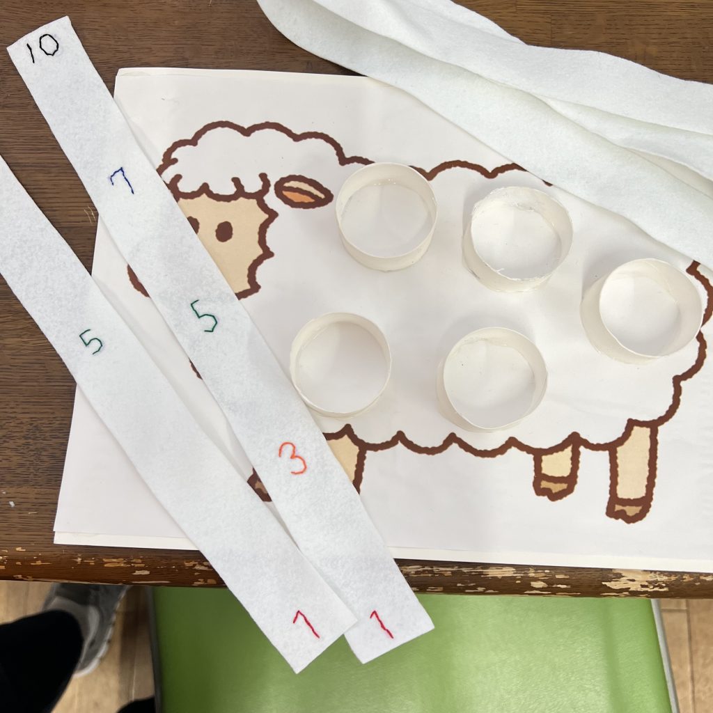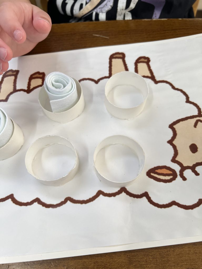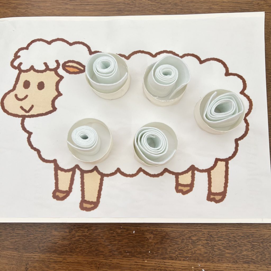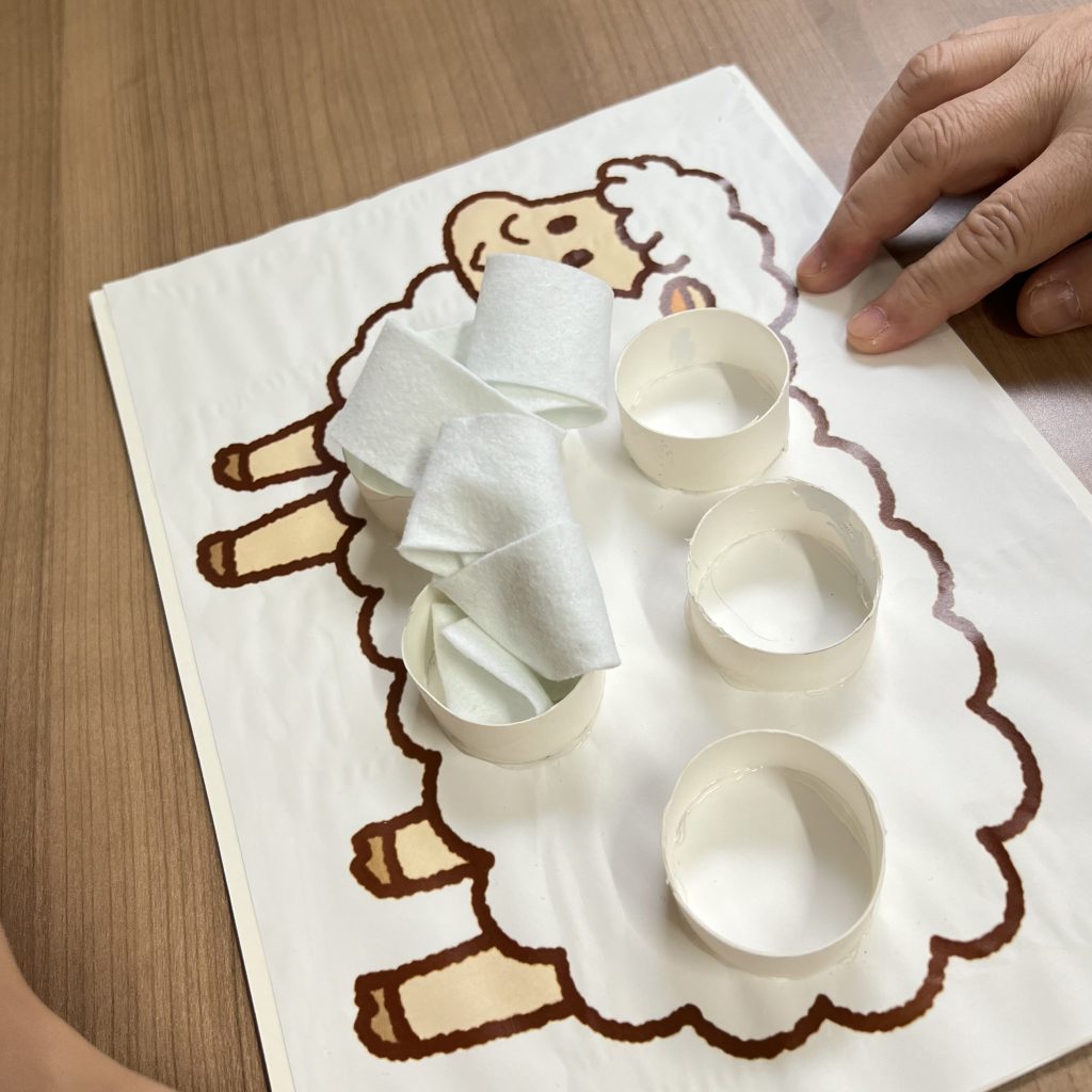 ほら、きれいに巻けたね。完成。 お母さんにもほほめてもらって、にっこり。ひつじもにっこり。