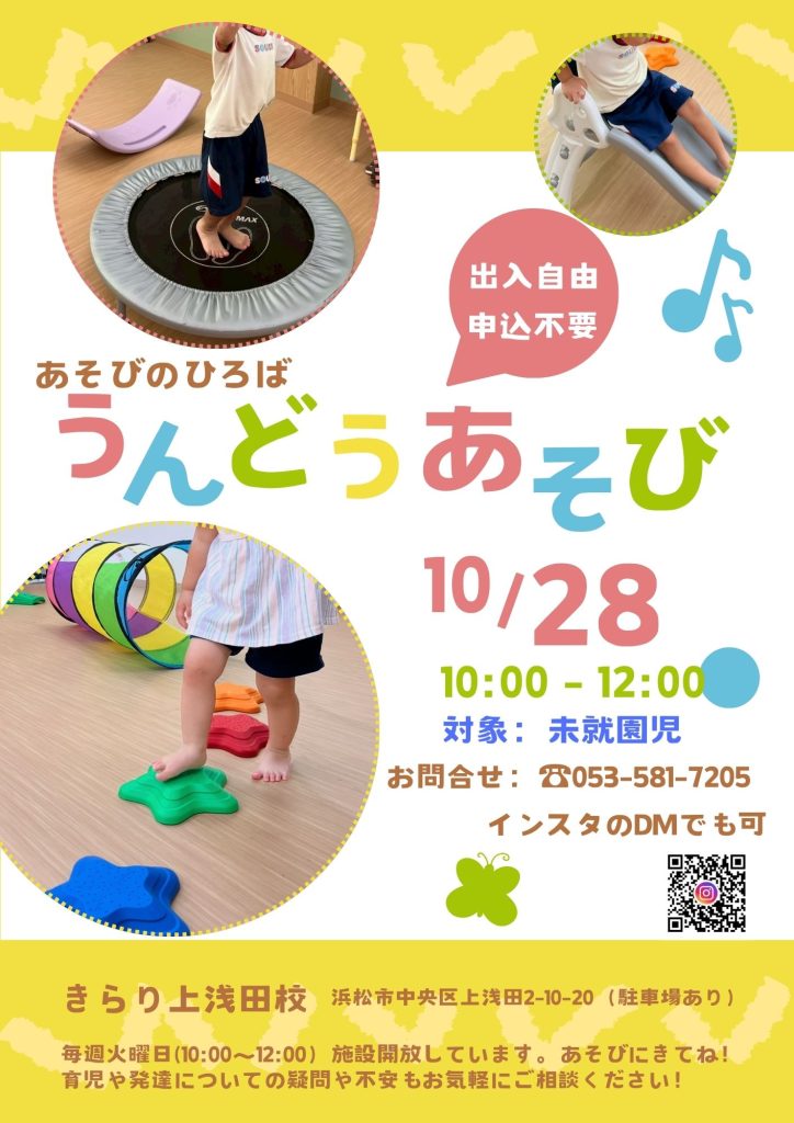 「きらり」上浅田校では、地域に開かれた事業所を目指した取り組みとして毎月「あそびのひろば」を開催しています。主に未就園児さんを対象に、リトミックや運動遊び、季節のイベントなどを企画しています。