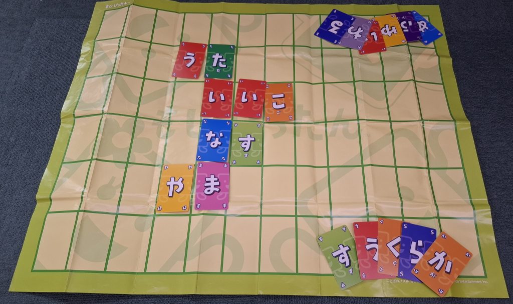 1人10枚ずつカードを持ち、場に出ているカードと繋げて言葉を作り出していき、カードが早くなくなったら人が勝ちです!