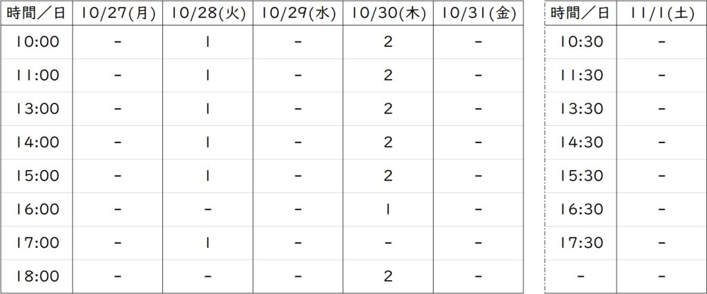 来週(10月27日~11月1日)の空き状況をお知らせいたします。