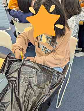黒いビニール袋にはさみを入れ、腕・首を通すところを切ってもらいました!