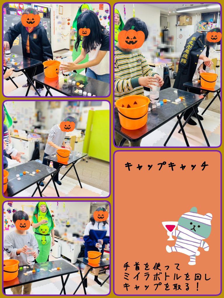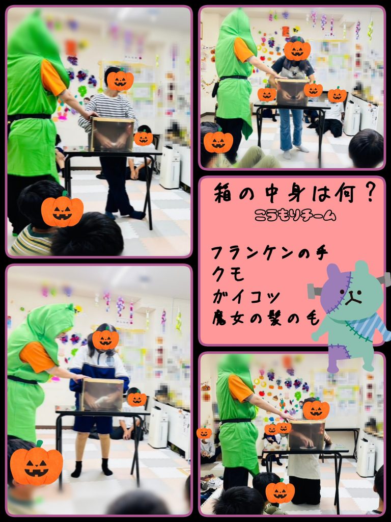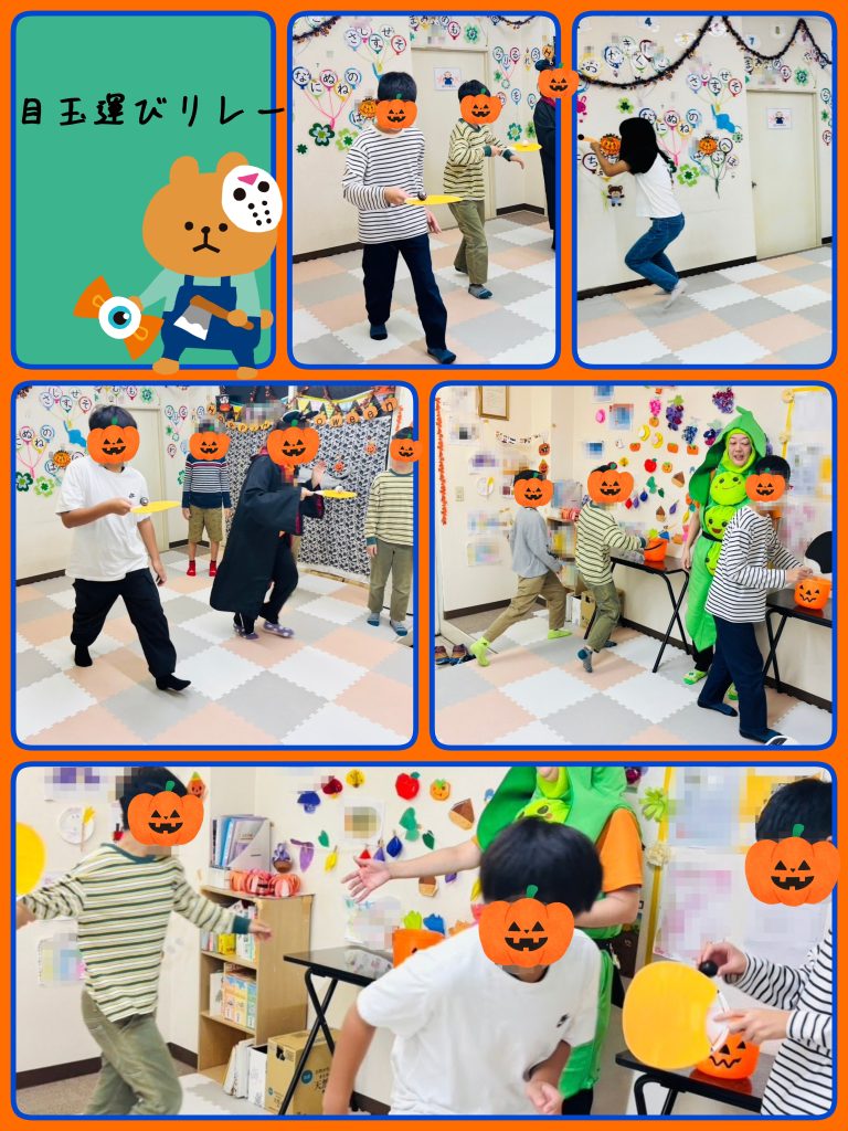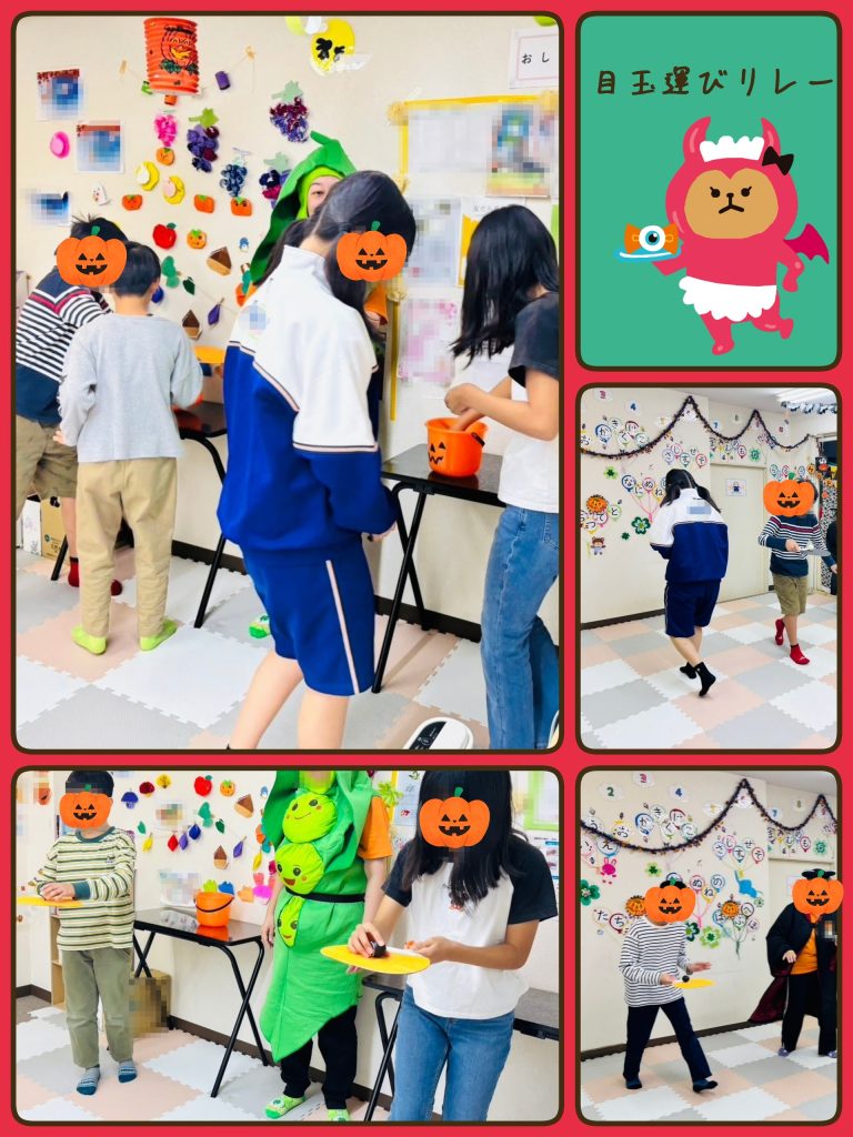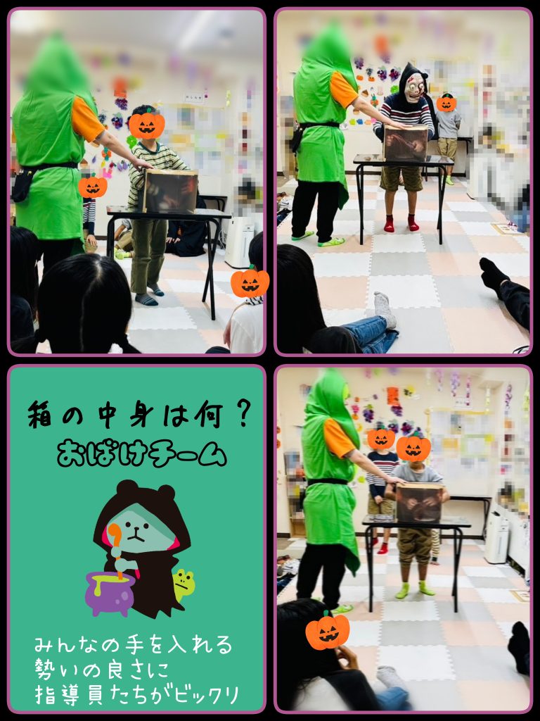 ゲームでは、2チームに分かれて対決。 こうもりチーム vs おばけチーム。 まず、勝ち負けにこだわらず『楽しむ』という気持ちを体感してもらえるよう声をかけました。また、悔しくてつい言ってしまいそうになる強い言葉も、それは言ってもいいことか考え、どうしたらぐっとこらえられるかを体験する場面ができ、すぐに指導員が声をかけました。「今よく我慢したね!」