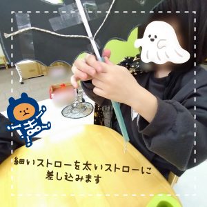 また、ストローの中に糸を送り込んでいく、その際の手の持ち替え、テープを貼る際の必要な長さ、そして押さえる時の指の位置など、難しい微細運動もありました。