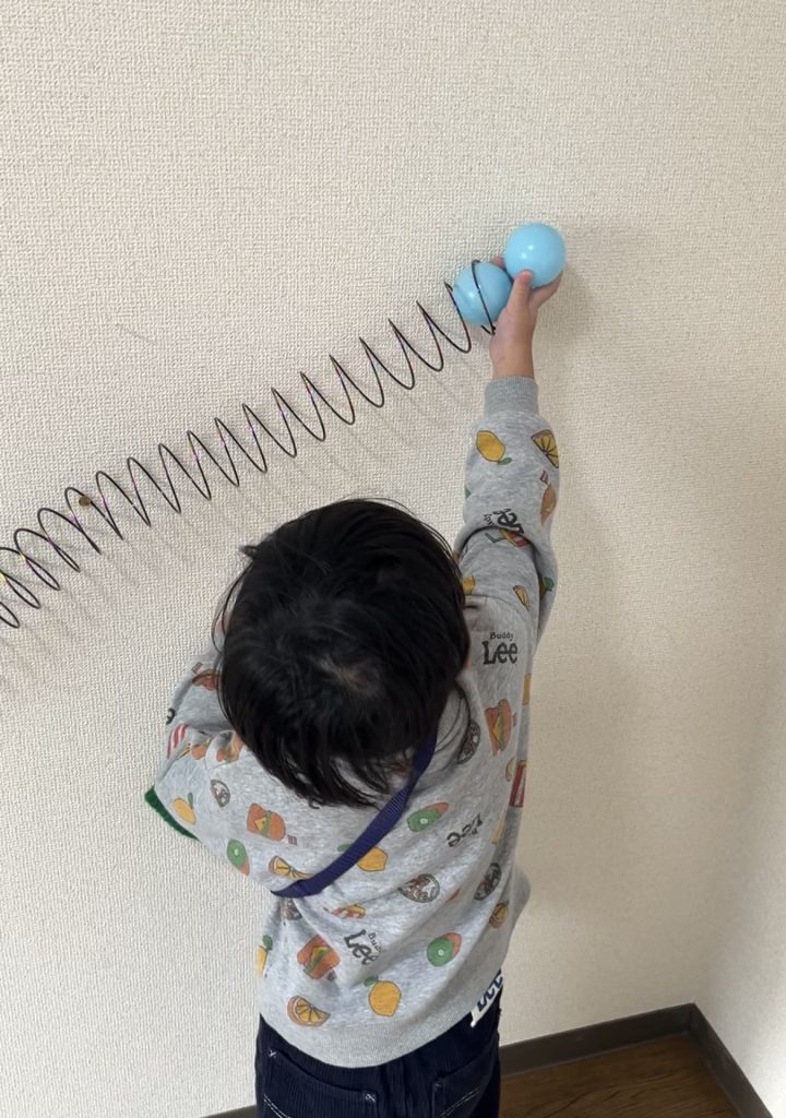 スリンキーを伸ばして壁に貼り、そこにカラーボールを入れます🖐🏻🔵