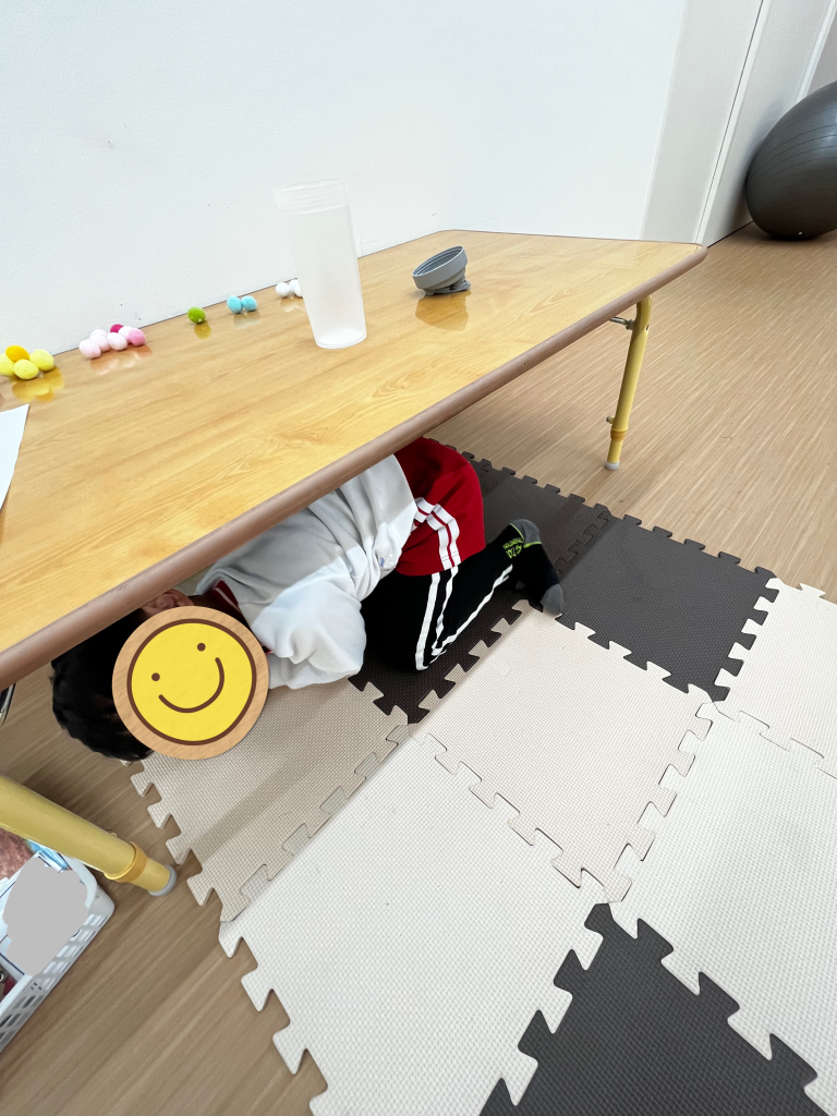 緊急地震速報の音が聞こえたらすぐに机の下に隠れてダンゴムシのポーズです。