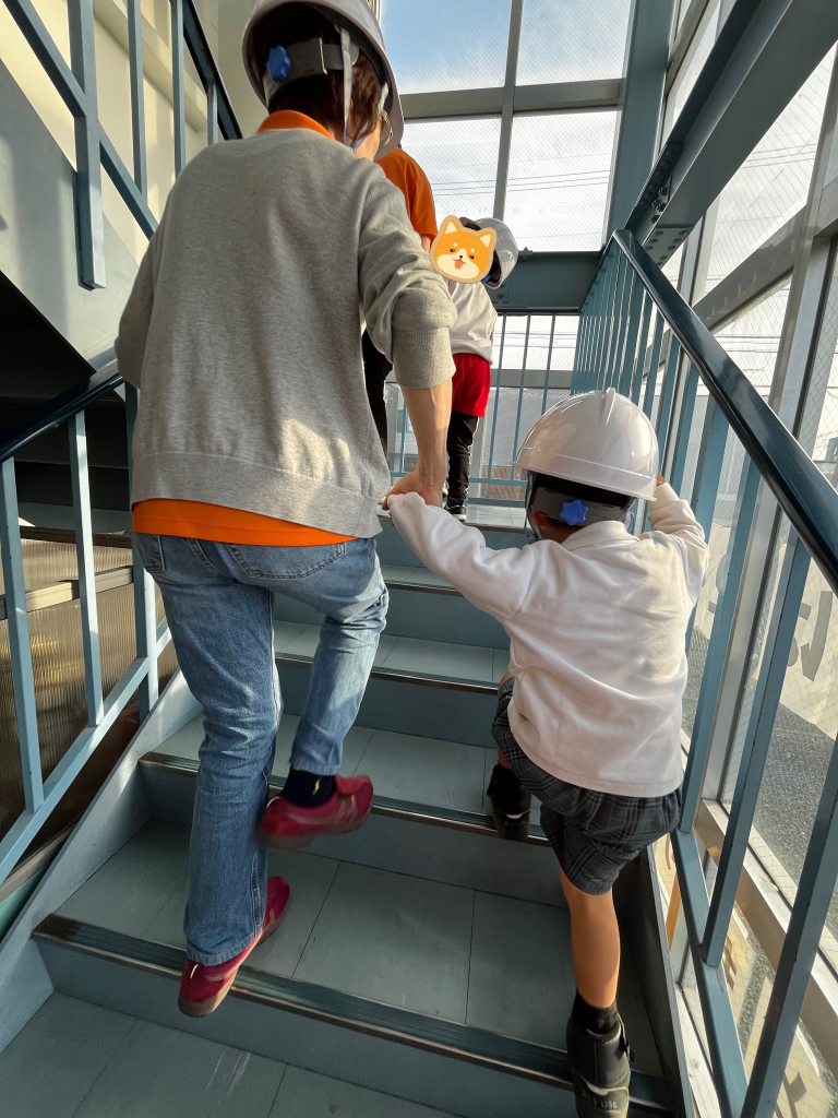 揺れが収まったら津波に備えて建物の上階に避難します。ヘルメットをかぶって靴を履いて準備万端です!
