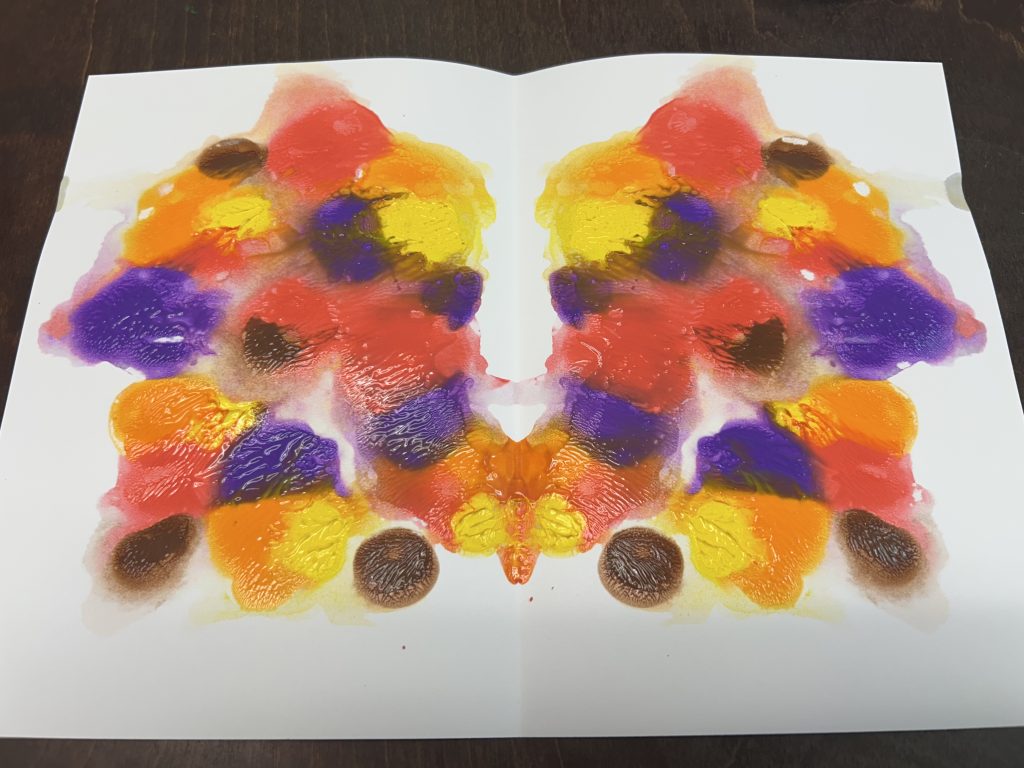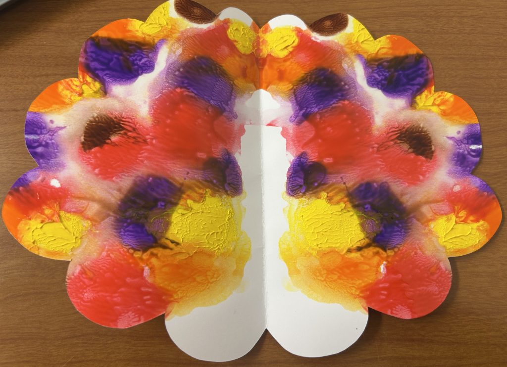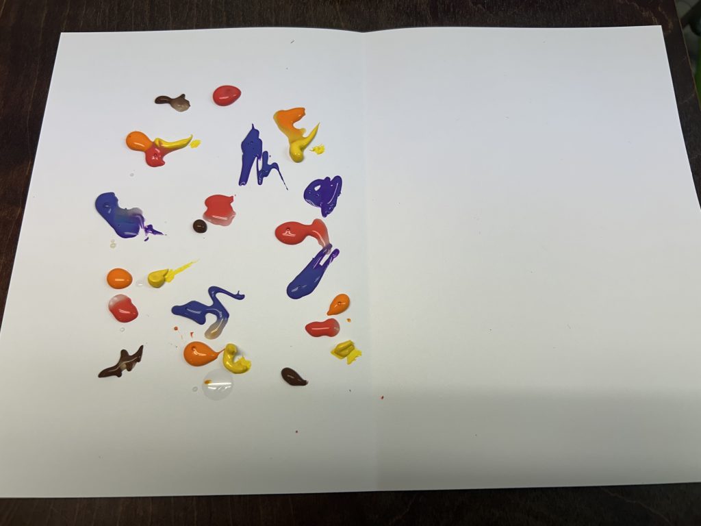 ②画用紙を半分に折り、半分に好きな色の絵の具を載せ、絵の具の上から少量の水を塗り広げます。絵の具を外側に載せすぎると画用紙からはみ出してしまうので注意してください。