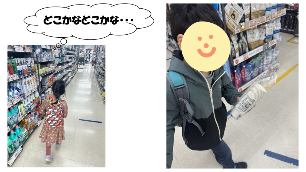 「この上に日用品って書いてあるから・・・」と表示を頼りに探す子もいれば、「このへんにあるはず!」と目星をつけて探す子もいました。