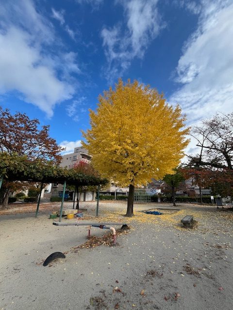 修学院校の近くの公園では、大きなイチョウの木が色づいていました!