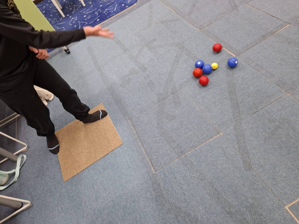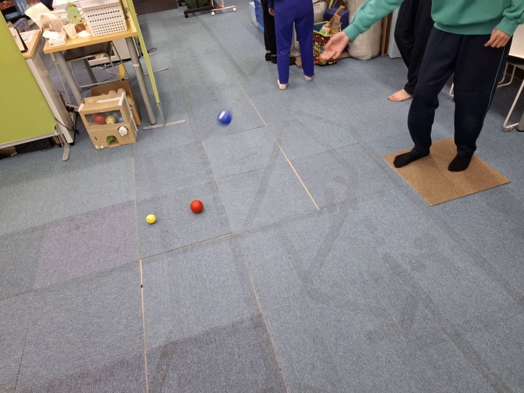 目印の玉をめがけて、ボールをなげていくスポーツです。