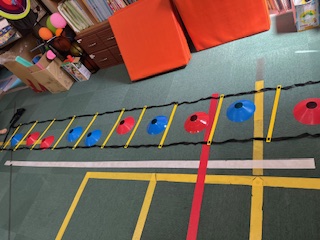 この黄色いのがラダー(はしご状のもの)です。そこに赤と青のコーンを置きます。