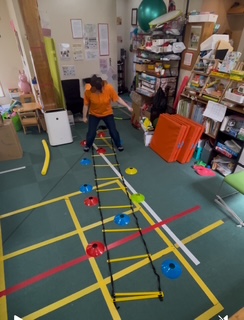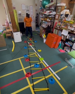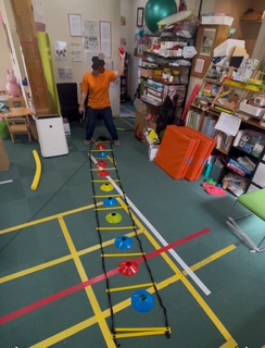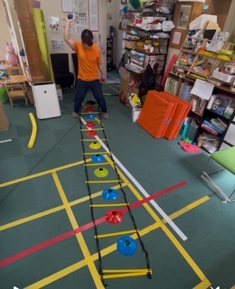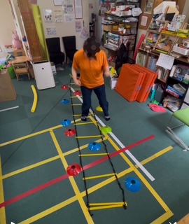 コーンをまたいだり、ラダーの線をまたいだりしてジャンプ!
