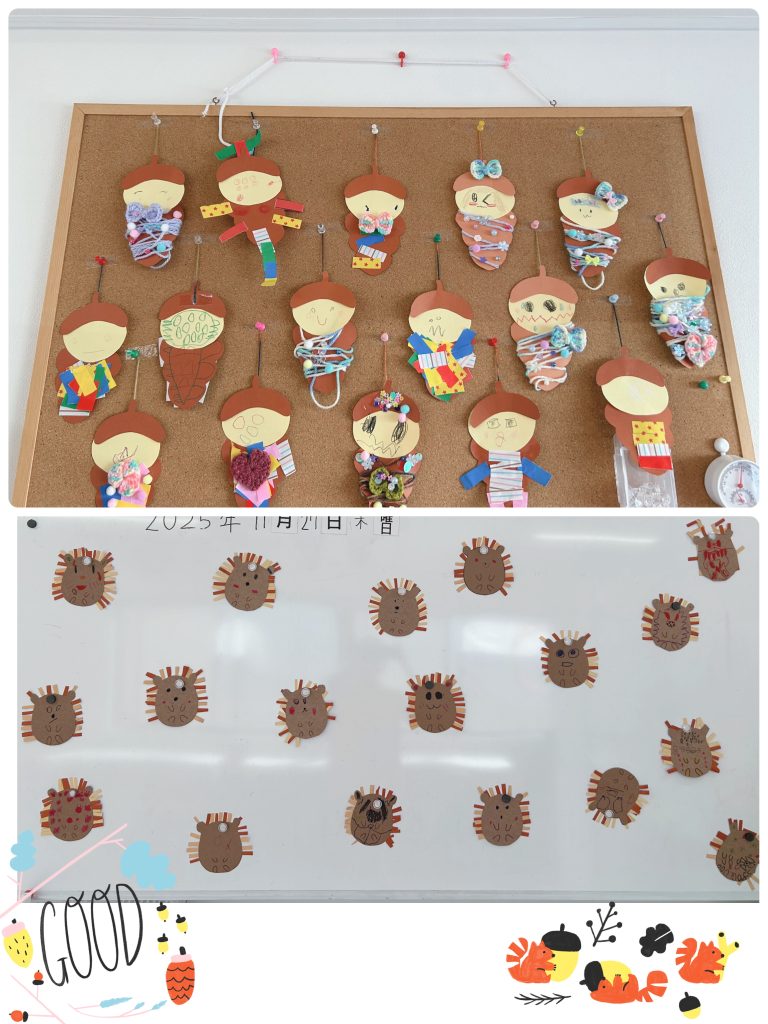 のりやハサミ、クレヨン等を使って可愛く制作することができました🦔