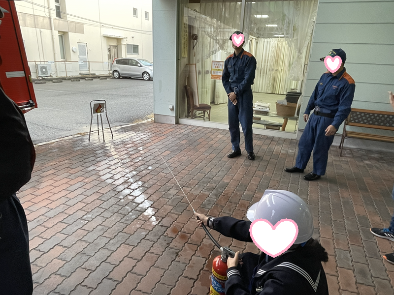 消火器を使う手順を消防士さんにサポートしてもらいながら、みんな最後までしっかり取り組むことができました。