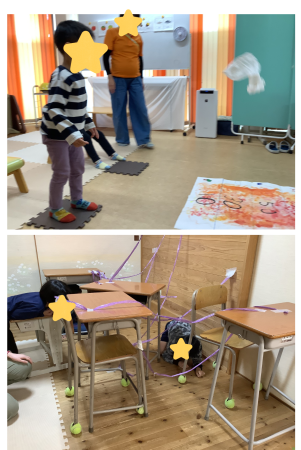 「廃材つみつみ」「コップパラシュート」「クモの巣くぐりの宝石探し💎」「きらりクイズ✨」「陣取りマグネット」をしました!