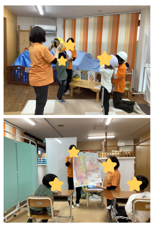 ハザードマップの確認や、ヘルメットの装着練習を行いました。