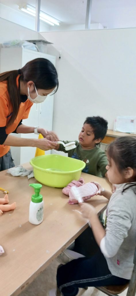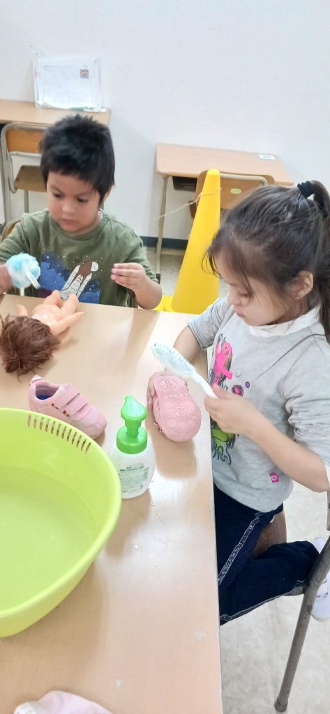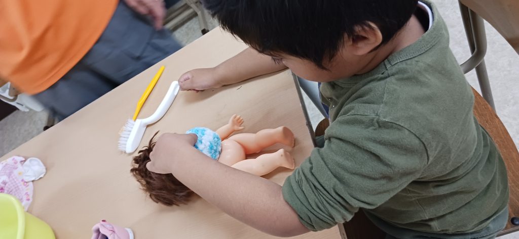 自発の子たちはお人形を使い汚れたところをきれいにしています🥰🥰