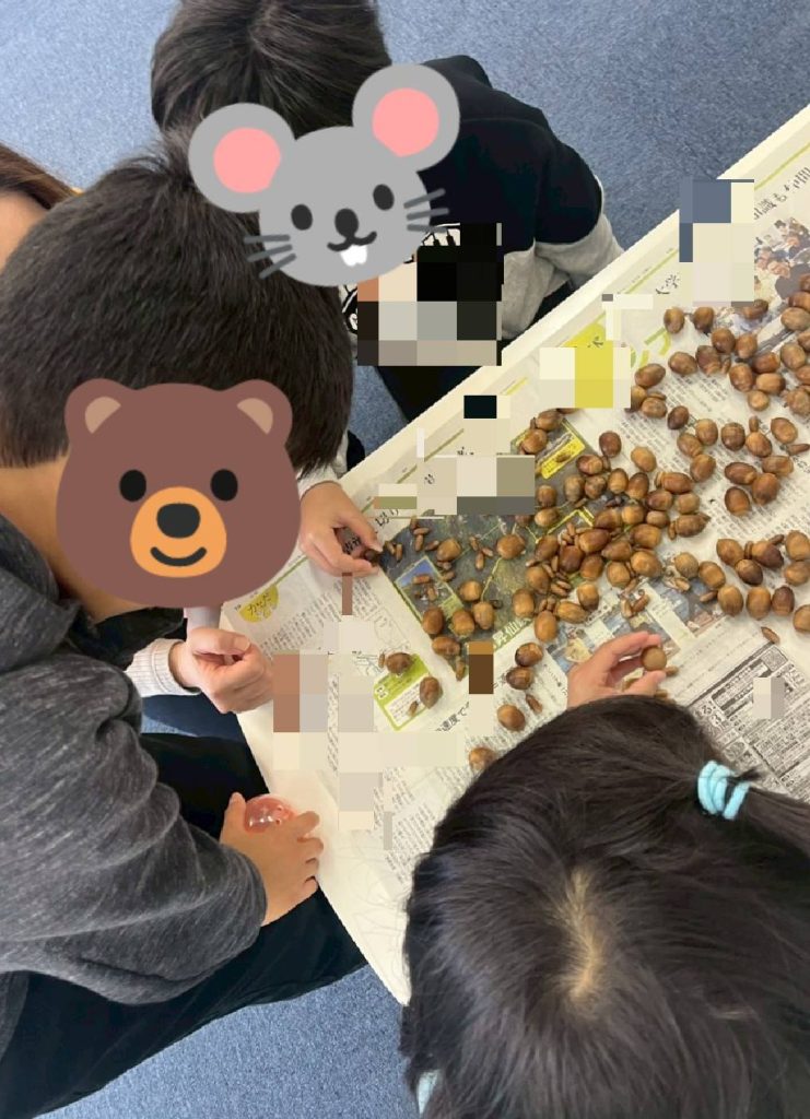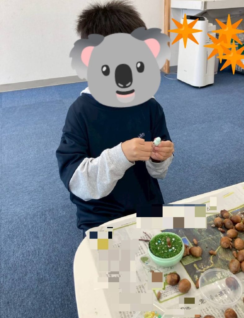11月も「パパママカフェ(保護者会)」「お買い物イベント」「秋を散策&製作」と様々なイベントが行われました。中でも11月3日に秋を散策(外出イベント)、そしてそこで見つけた秋の素材を使って11月24日に製作をする取り組みを行いました。