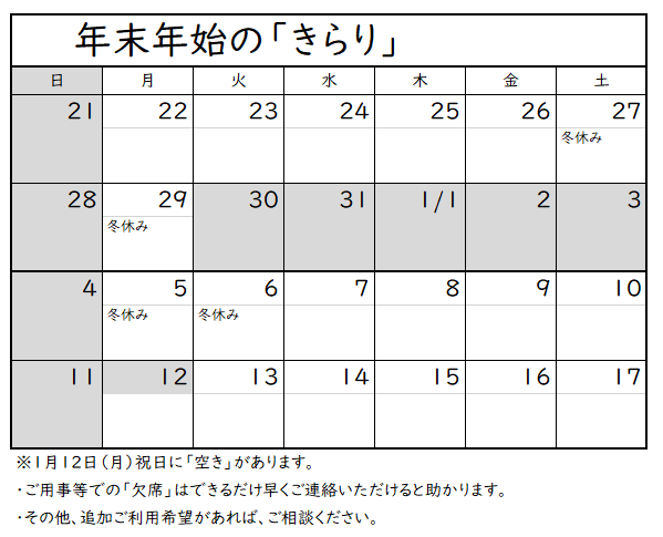 2025年は12月29日(月)まで開所いたします。冬休み中ですので、ぜひご利用ください。