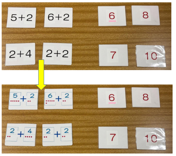【上の写真】「5+2はいくつかな。赤いカードから答えを選んでね。」