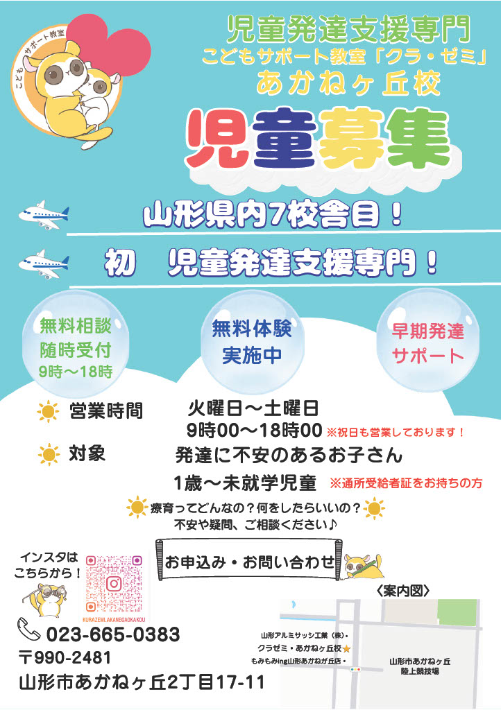令和7年12月1日(月)に開校し、山形県内7校舎目、そして初の児童発達支援専門のクラ・ゼミです(^^)/