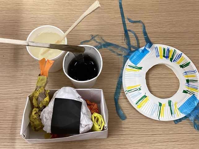 紙皿で作ったフリスビー(写真右)を工作しました。