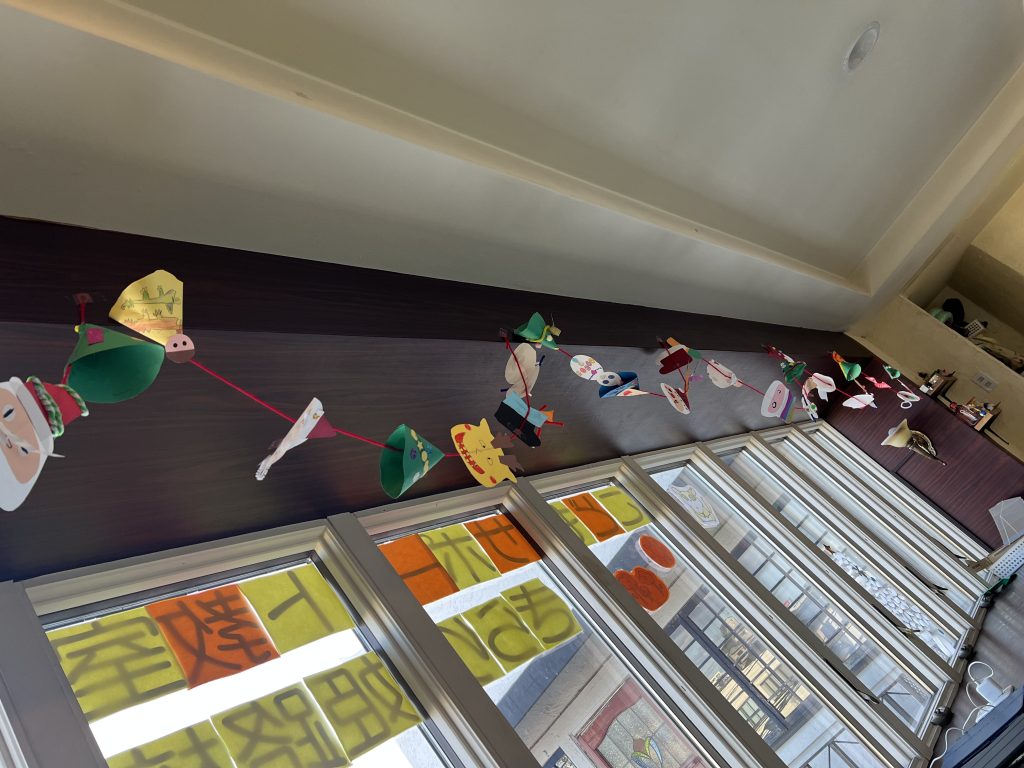 紙皿で作った雪だるまやペーパークラフトを飾っています⛄