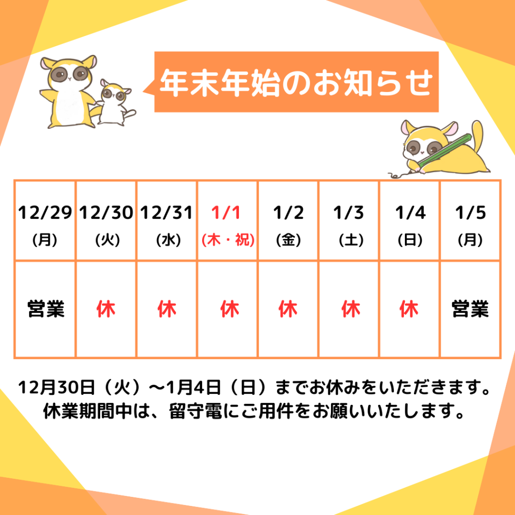 年末年始の営業日についてのお知らせです。