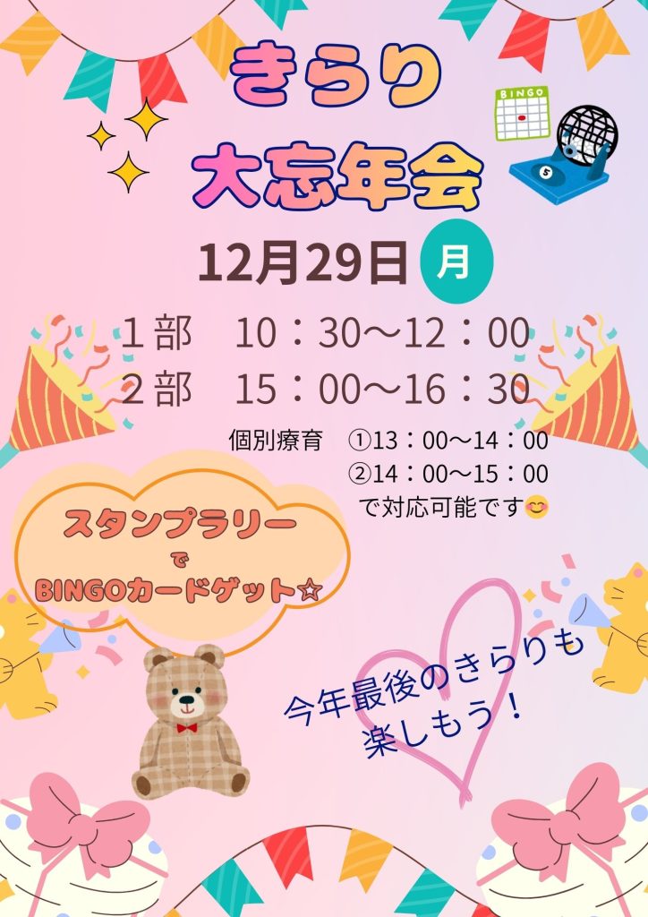 さて、きらりでは年末最後のイベントとして、12月29日(月)に『忘年会』を開催いたします🎉