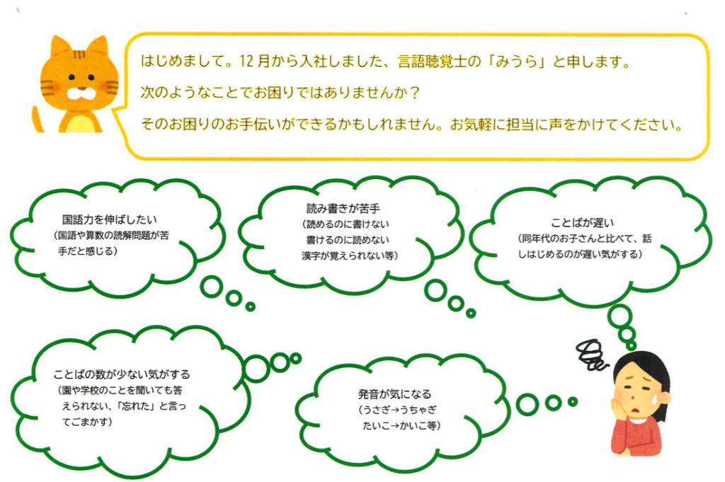 12月より「言語聴覚士」の三浦が「きらり」多治見校のスタッフに加わりました。