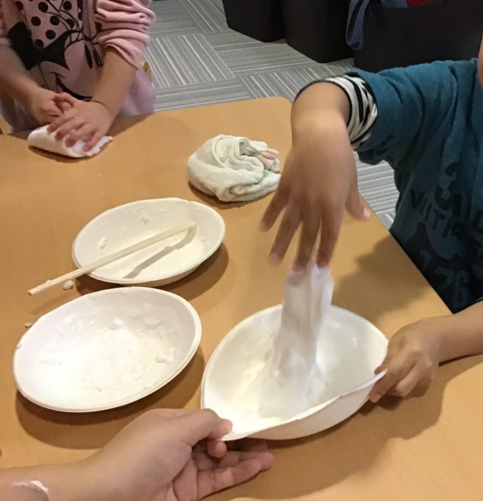 材料は、洗濯のり・コンスターチ・木工ボンド・シェービングフォーム・ホウ砂