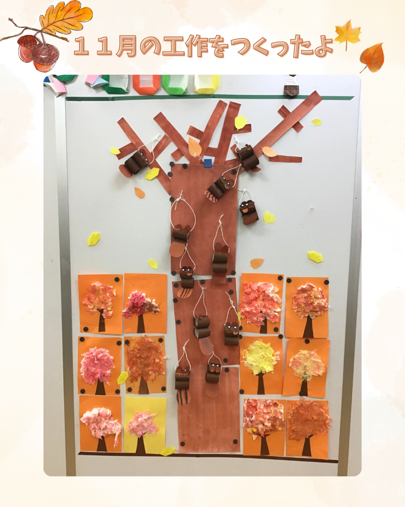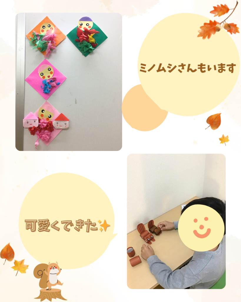 今月は紅葉の工作と、リスの工作、そしてミノムシの工作を行いました!