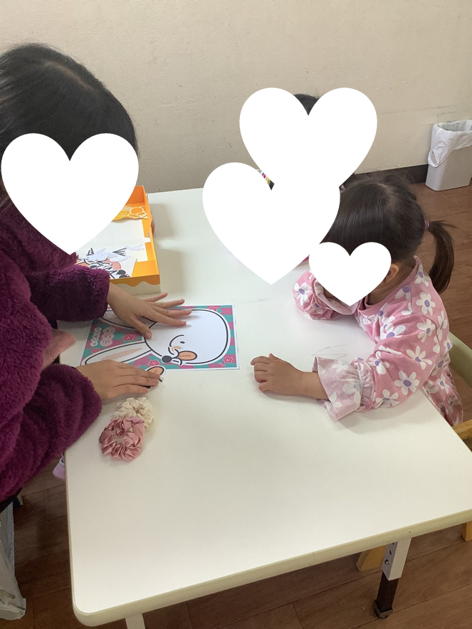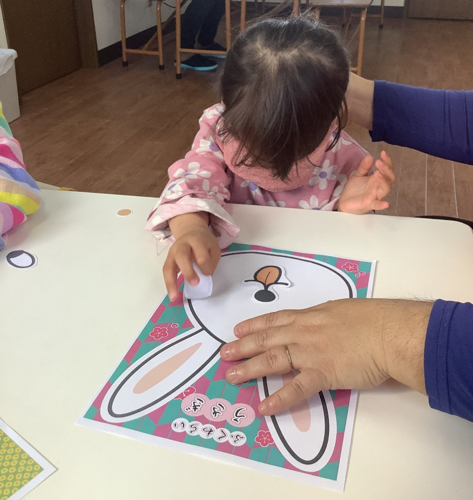 児発では福笑いを行って、子どもたちは目隠しにドキドキしながらも、上手に取り組んでいました。