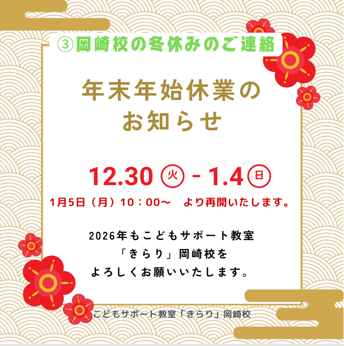 岡崎校では明日12月30日(火)~1月4日(日)までお休みをいただきます。