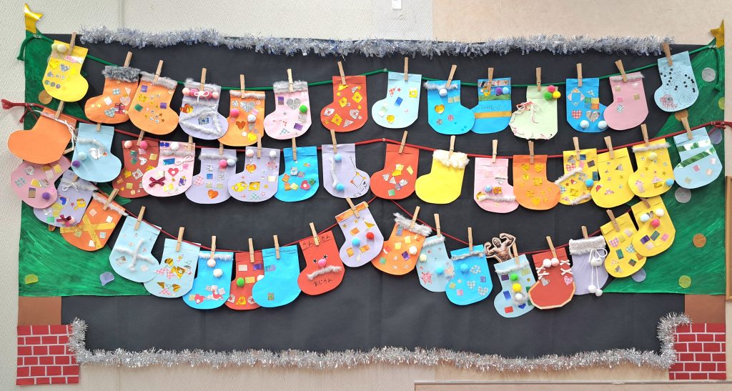 さて、12月の壁面のクリスマスブーツもきれいに飾られました👢