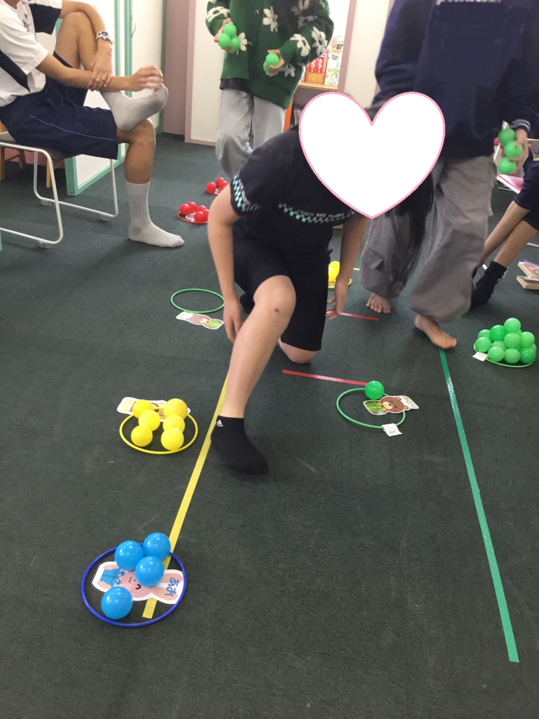 次は、体を動かすカラーボール運びゲーム🎈紐のついた箱に入ったカラフルなボールをこぼさないように輪の中に入れます。ゆっくり慎重にする子、スピードに挑戦する子、それぞれの個性が光る場面でした✨