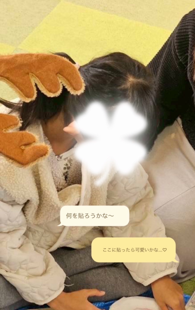「どこに貼る?」「絵はここに書こうかな」などお話を楽しみながら取り組む姿が見られ、