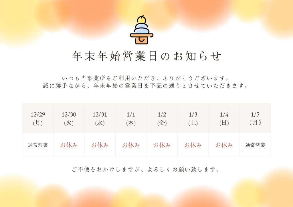 あわせて、年末年始の営業日についてお知らせです。