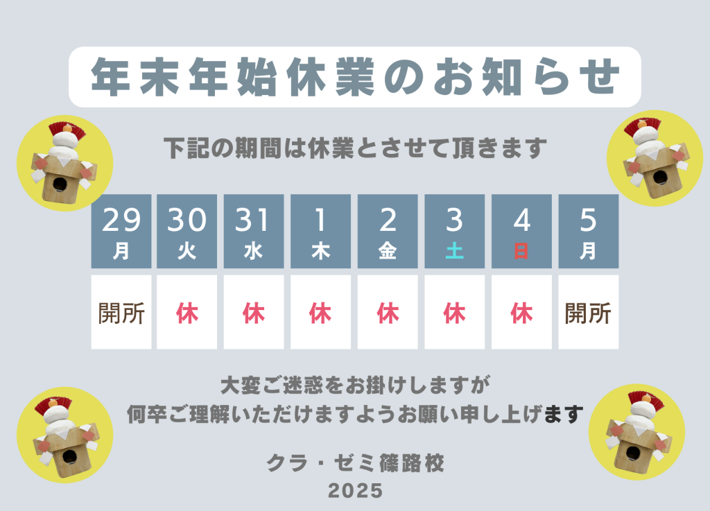 今年も、あとわずかですが・・・年末のご挨拶と、年始の開所日程のご案内をさせていただきたいと思います。